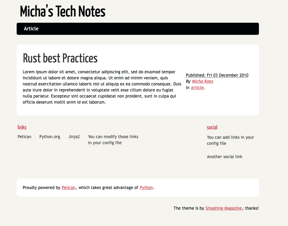 Prerequisites We need to have at least Docker installed. Creating the Blog First we’re creating a new directory for our blog and generate the blog structure using William Jackon’s docker-pelican: mkdir my-site cd my-site docker container run -it --rm --entrypoint pelican-quickstart -v ${PWD}:/pelican-site ghcr.io/williamjacksn/pelican Welcome to pelican-quickstart v4.9.1. This script will help you create a new Pelican-based website. Please answer the following questions so this script can generate the files 1 Title: My First Review needed by Pelican. > Where do you want to create your new web site? [.] > What will be the title of this web site? Micha's Tech Notes > Who will be the author of this web site? Micha Kops > What will be the default language of this web site? [C] > Do you want to specify a URL prefix? e.g., https://example.com (Y/n) Y > What is your URL prefix? (see above example; no trailing slash) https > Do you want to enable article pagination? (Y/n) n > What is your time zone? [Europe/Rome] > Do you want to generate a tasks.py/Makefile to automate generation and publishing? (Y/n) > Do you want to upload your website using FTP? (y/N) > Do you want to upload your website using SSH? (y/N) > Do you want to upload your website using Dropbox? (y/N) > Do you want to upload your website using S3? (y/N) > Do you want to upload your website using Rackspace Cloud Files? (y/N) > Do you want to upload your website using GitHub Pages? (y/N) Done. Your new project is available at /pelican-site ...