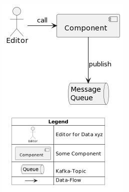 The following hack allows us to draw a diagram in a diagram in a table in a legend :D example-diagram.puml @startuml skinparam legendBackgroundColor transparent skinparam legendBorderColor transparent actor Editor as editor queue Queue as "Message\nQueue" editor -> [Component] : call [Component] --> Queue : publish legend right {{ scale 0.7 skinparam defaultFontSize 14 skinparam BackGroundColor transparent skinparam defaultBackgroundColor white !procedure $entry($type, $label, $scale=1) {{\nscale $scale \nskinparam backgroundcolor transparent\nlabel " " as A\nlabel " " as B\n $type \n}} => $label !endprocedure map "<b>Legend</b>" as legend #white { $entry(":Editor:","\nEditor for Data xyz", 0.6) $entry("[Component]","\nSome Component", 0.8) $entry("queue Queue","\nKafka-Topic", 1) $entry("A -> B","Data-Flow") } }} endlegend @enduml ...