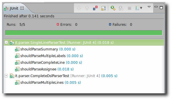 Now we’re ready to test the parser for a given input. The following JUnit tests should be green: