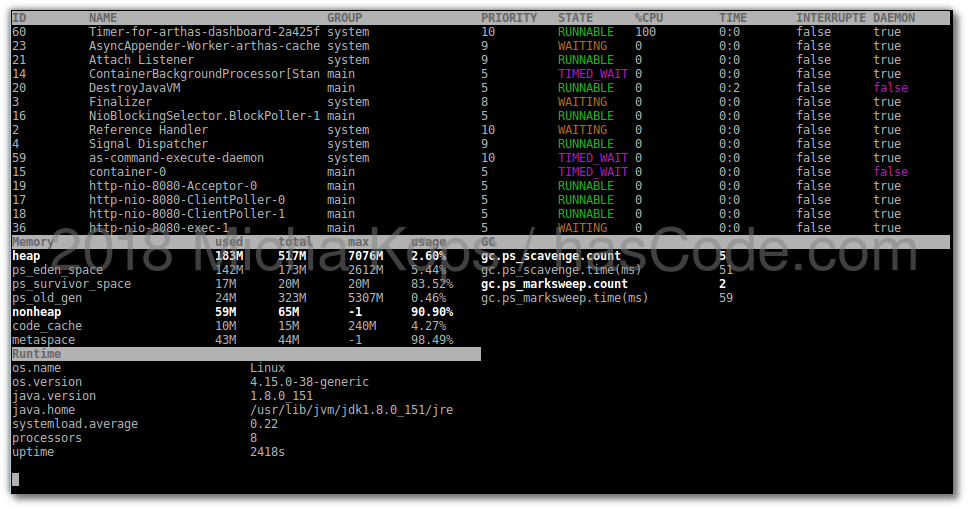 Arthas created by Alibaba is a tool that allows developers to connect to running Java applications without stopping them or suspending threads for debugging the application from the console. It offers features like monitoring invocation statistics, searching for classes and methods in the classloaders, view method invocation details (like parameters), show the stack trace of a method invocation, monitor system metrics and others. In the following examples I’m going to demonstrate some of these features applied to a running web application. ...