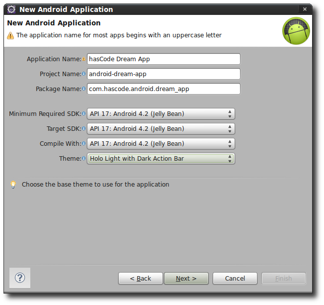 First of all we need a new android project. I am using Eclipse and the ADT plugin here but any other solution like using a specific Maven archetype and the Jayway Maven plugin or using SBT should work, too.